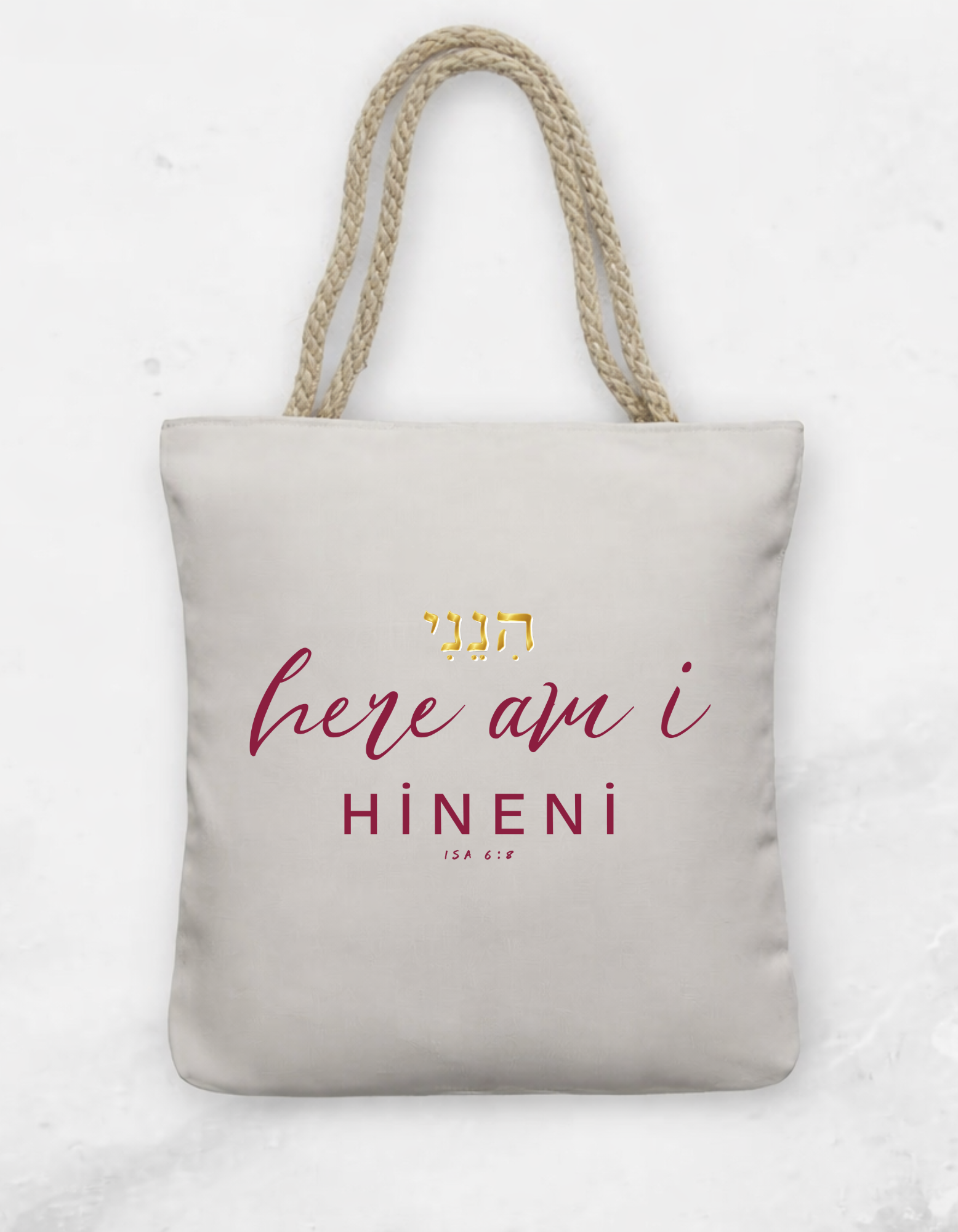 ISA 6:8 "HINENI - Here I am" faith inspired Tote Bag with Rope Handle for believing women of God.